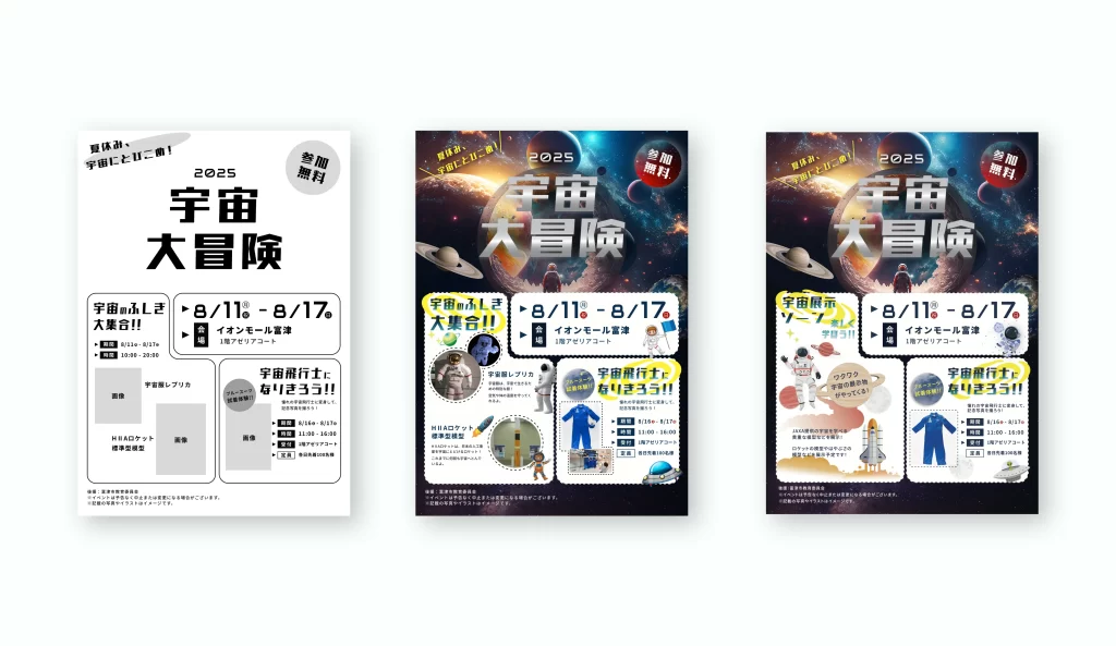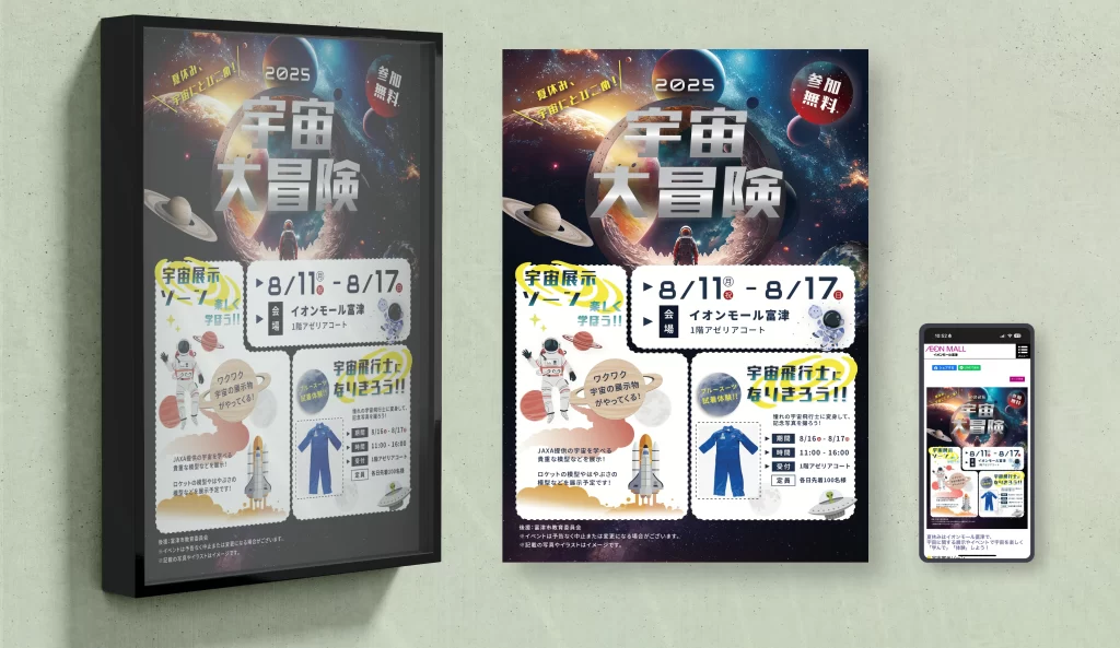 イオンで開催されるイベント用チラシ制作では、宇宙冒険の雰囲気を表現することが求められ、またお客様からは特にレイアウトやタイトルに関して、明確な分割で活動を見せること、タイトルはロゴのようなデザインにすること、という要望がありました。